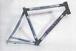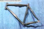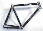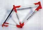 "The frames you see in the photos are hand-made, custom-sized, with carbon glued and bandaged tubes. These carbon frames are hand made with the same method used for the steel frames. The only difference is that the carbon frames are glued with a special material, while the steel frames are brazed. The photos from 2nd to 5th refer to the more recent carbon frames. The best solution in order to obtain the best performances is the number 4 and 5, glued and bandaged frames. The photo no 3 represents an example of carbon frame with silver parts in aluminium glued but not bandaged. The photo no 2 represents a frame with red parts in aluminium and the black part in glued carbon." |